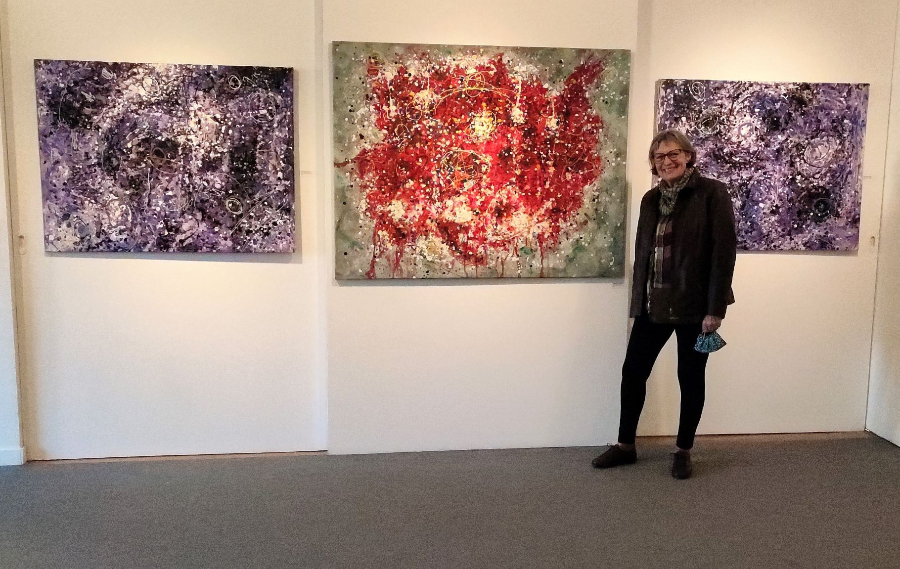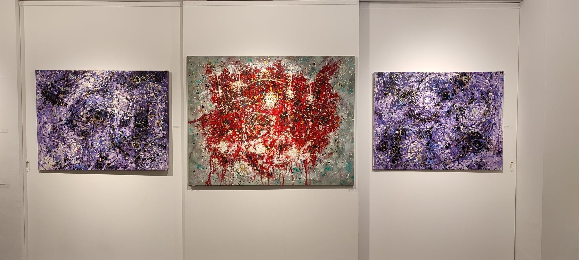 - 2 Constel·lacions en lila’s I i II- 116 por 89 cm . I Constel·lacio en vermells. 146×114 cm. Mixtes sobre tela. Any 2017. Any Pollock