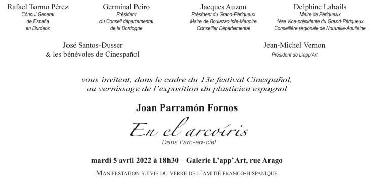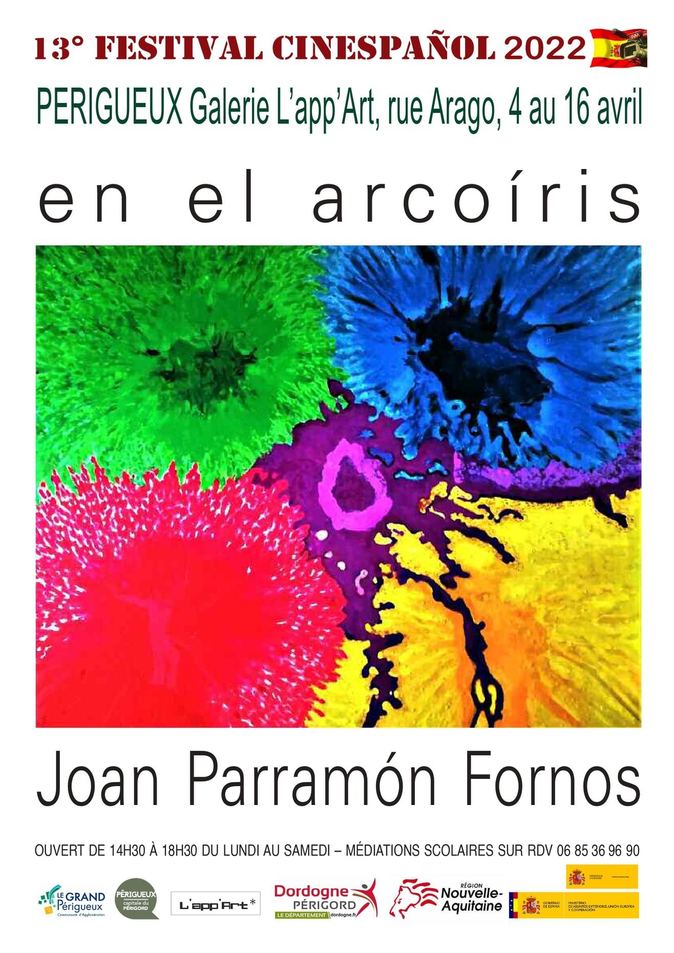 France. Perigueux. Galerie l’APP Art. Avril 2022, Joan Parramón. En el ArcoIris/Dans L’Arc-en-Ciel. L’artiste barcelonais entame une valse d’abstractions lumineuses, suite logique de ses précédentes recherches sur la transcription abstraite de ses éblouissances solaires.