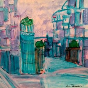 Viaje a SAMARKANDA. 40×40 cm. acrilico sobre papel. la llegada a SAMARKANDA